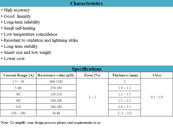 產品描述:One of the main current sensor used in kWh meter. Much more economical than current transformer. Electron beam shunt is high technology product. Strict requirement for manganin and copper materials.